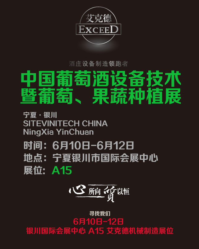 第四屆中國葡萄酒設備技術暨葡萄、果蔬種植展(SITEVINITECH CHINA)將于2015年6月10日至12日在銀川市國際會展中心舉行。艾克德機械制造公司也將參展。